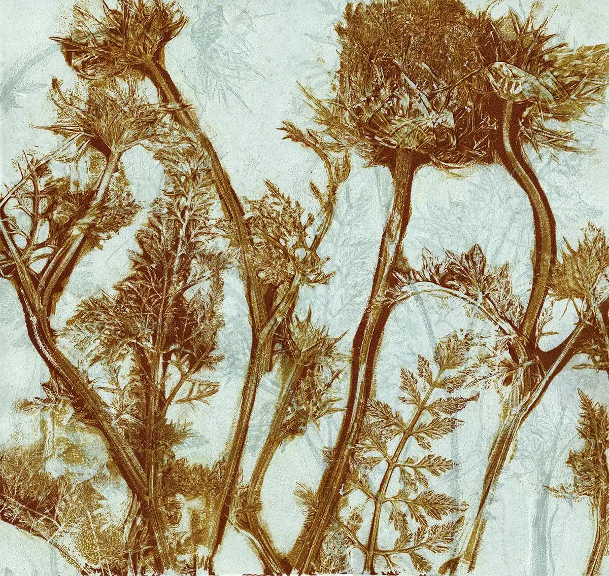 Ses monotypes capturent l’empreinte délicate des feuilles et des tiges, révélant des images uniques, nées du dialogue entre encre, pression et geste. Avec ses éco-impressions, elle laisse les plantes imprimer elles-mêmes leur couleur et leur mémoire sur le papier, offrant des traces imprévisibles façonnées par la chaleur, l’humidité et le temps.